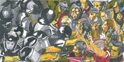 Pensándolo mejor, ¿porqué así? Indignado. Claro, en ese entonces podía pagar la hipoteca del piso cada mes. Irme de viaje. Los viernes salir de compras. Renovar muebles y electrodomésticos de la casa. Cada cinco años cambiar el coche por otro nuevo. Y poder exteriorizar materialmente mis logros. Ante mis padres, ante mis amigos, ante mí. Ahora no consigo otro curro en dónde no gane más de mil duros. La pasta se va antes que el mes. Los del banco no se detuvieron. Llegó la orden de desalojo y con ella los polis, “…o te rajas o te sacamos”.