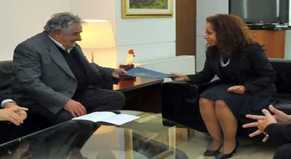 El Presidente de la República José Mujica recibió las cartas credenciales diplomáticas de la nueva embajadora de Estados Unidos en Uruguay, Julissa Reynoso, en su despacho de la Torre Ejecutiva. Reynoso y el ministro de Relaciones Exteriores Luis Almagro expresaron ante la prensa su coincidencia para trabajar de manera estratégica en avanzar sobre temas comerciales y la cooperación en educación, ciencia y tecnología. La nueva embajadora de EEUU. en nuestro país indicó que Uruguay es un ejemplo de democracia estable y compromiso con los valores democráticos y los derechos civiles.