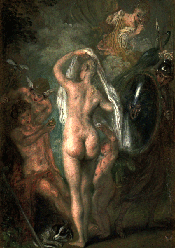 Watteau El Juicio de Paris Por ejemplo en “Los placeres del Baile”, en el centro de la composición, dentro de una arcada de mármol blanco y azul, con nichos que guardan dioses griegos, abriendo un jardín al fondo, en este pequeño paraíso un grupo de elegantes burgueses bailan, mientras una pareja preside la celebración, él está de frente, con el pie ligeramente levantado inclinando el cuerpo al ritmo de la música, y ella de espaldas al público, a nosotros, los testigos temporales de este escena, su cabello rojo peinado que destaca su vestido de seda, y un collar de encaje, la dama se levanta el vestido para seguir a su compañero. No vemos su rostro, imaginamos que es la más bella y celoso Watteau la oculta. La excitación de tenerla y la angustia de mostrarla.