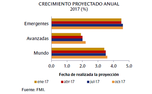 De acuerdo con las proyecciones del Fondo Monetario Internacional (FMI)1, luego de haberse expandido 3.2% en 2016, la economía global mostraría mayor dinamismo: 3.6% en 2017 y 3.7% en 2018, corrigiendo levemente al alza las proyecciones de julio. Las economías avanzadas crecerían 2.2% en 2017 y 2.0% en 2018 (el crecimiento de estas economías fue 1.7% en 2016), mientras que las emergentes se expandirán 4.6% en 2017 y 4.9% en 2018, frente al 4.3% registrado en 2016.
