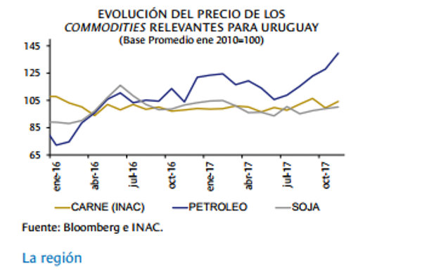 Los precios de las materias primas relevantes para Uruguay se han mostrado al alza, aunque los precios de energéticos continuaron fortaleciéndose más que los agrícolas. En particular, el precio del petróleo mostró presiones al alza, tanto por la mayor demanda esperada como por el acuerdo entre OPEC y otros importantes productores como Rusia (que se extendió hasta fines de 2018-.