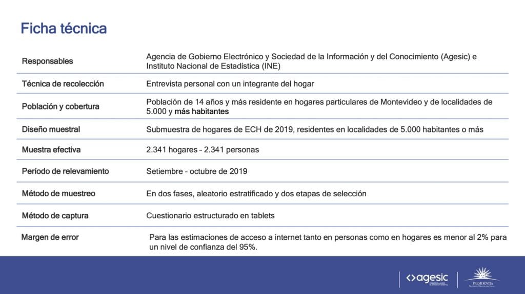 Resultados preliminares de EUTIC 2019 | Agencia de Gobierno Electrónico y Sociedad de la Información y del Conocimiento https://www.gub.uy/agencia-gobierno-electronico-sociedad-informacion-conocimiento/comunicacion/noticias/resultados-preliminares-eutic-2019 2/2 Datos sobre el estudio La nueva edición de EUTIC fue realizada en conjunto entre Agesic y el Instituto Nacional de Estadística (INE) entre octubre y noviembre de 2019. Se trata de la cuarta edición del estudio (las anteriores corresponden a 2010, 2013 y 2016), que en conjunto permiten analizar en profundidad la evolución nacional de diferentes indicadores de la Sociedad de la Información y el Conocimiento. El universo de estudio es la población de 14 años y más residente en hogares particulares de Montevideo y en localidades de 5.000 y más habitantes. Se aplica a una submuestra de la Encuesta Continua de Hogares (ECH), encuestando a una persona sorteada en cada hogar a través de una entrevista personal. La edición de 2019 abarcó 2.341 casos. El margen de error para las estimaciones de acceso a internet tanto en personas como en hogares es menor al 2% para un nivel de confianza del 95%.