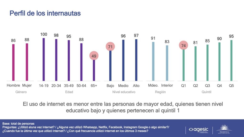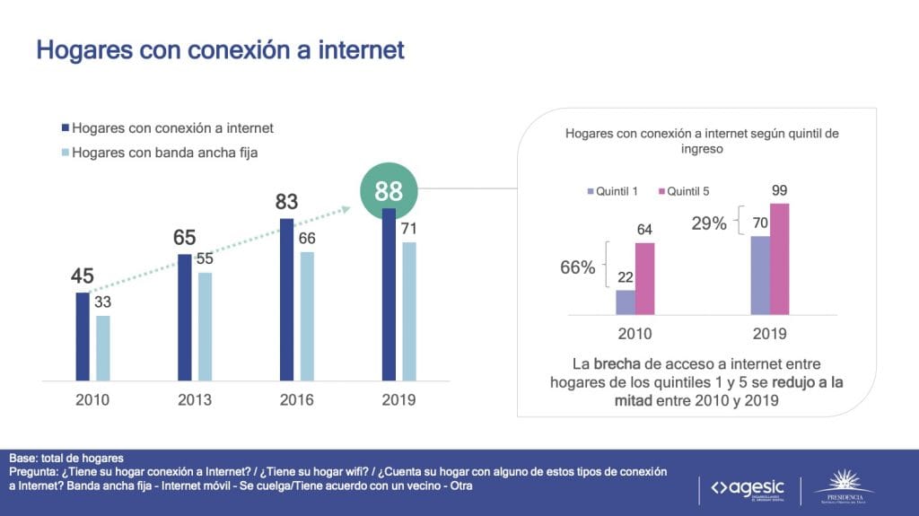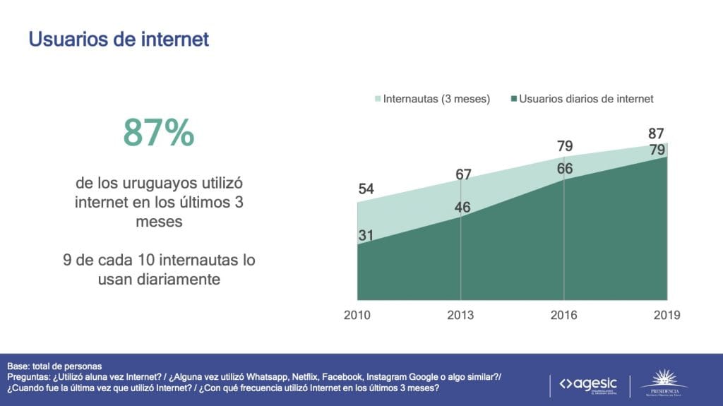 Los datos preliminares de la nueva edición del estudio, realizado en 2019, muestran que en la última década el acceso a internet se ha universalizado en Uruguay a través de un proceso de crecimiento sostenido en todos los segmentos de la población. Esta evolución ha permitido disminuir a la mitad la brecha digital entre los hogares con diferentes niveles de ingresos. En 2010, el 22% de los hogares más pobres accedía a internet y el 64% de los más ricos. En 2019, las cifras ascienden a 70% y 99%, respectivamente. En la actualidad, nueve de cada diez personas acceden a internet y se ha intensificado su uso: el 79% de la población se conecta diariamente, mientras que en 2010 lo hacía únicamente el 31%.