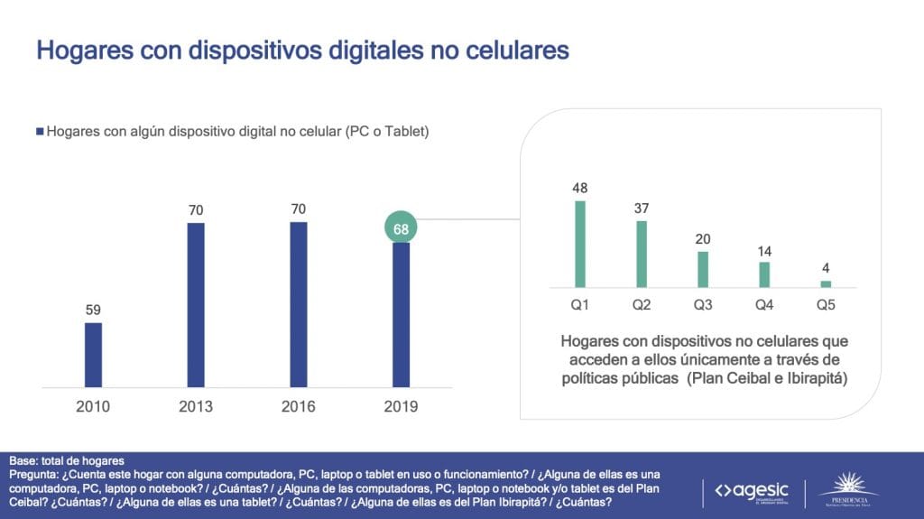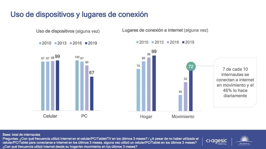 En los únicos segmentos en que aún no se observan estos altos niveles de acceso son el de los adultos mayores y el de las personas de nivel educativo bajo. Entre los internautas se ha universalizado la conexión diaria por celular y solo el 30% lo hace desde una computadora. El uso de computadoras ha disminuido significativamente en los últimos años. Si bien esta tendencia se observa a nivel mundial, en nuestro país el despliegue de políticas públicas ha mejorado el acceso de los hogares a dispositivos no celulares. Entre los hogares que acceden a estos dispositivos, una de cada cinco personas lo hace gracias a que solo cuenta con alguna computadora o tablet de los programas Plan Ceibal o Ibirapitá. Este impacto es mayor en el 20% de los hogares de menor ingreso, ya que la mitad de ellos accede a los dispositivos de estos programas. Acompañando la universalización del celular, la conexión en movimiento (o ubicua) continúa creciendo: en 2010 menos de la tercera parte de los internautas declaraban conectarse en esta modalidad y en 2019 lo hacen el 72%.