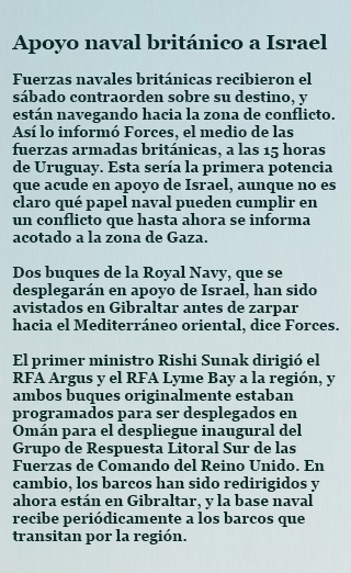 Ahora se sabe además que Gran Bretaña enviará aviones y barcos de su fuerza militar para apoyar a Israel y que no desplegará tropas en el territorio. Gran Bretaña ya tiene activos en la región, incluido el HMS Duncan en el Mediterráneo –que está bajo el mando de la OTAN y pasa a ser el buque insignia de la flota–, una presencia marítima permanente en el Golfo y una base naval en Akrotiri, Chipre. Junto con Dekelia, donde Gran Bretaña tiene una base aérea, suman el 3% de la superficie de la isla, y el 60% de su población es británica.