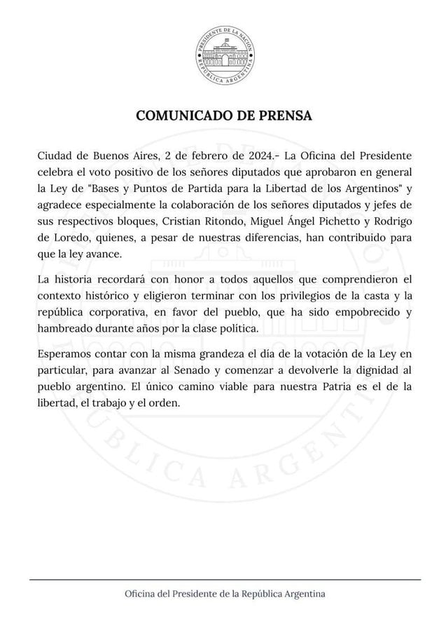 Más tarde desde la Oficina del Presidente lanzaron un comunicado: «La Oficina del Presidente celebra el voto positivo de los señores diputados que aprobaron en general la Ley de ‘Bases y Puntos de Partida para la Libertad de los Argentinos’ y agradece especialmente la colaboración de los señores diputados y jefes de sus respectivos bloques, Cristian Ritondo, Miguel Ángel Pichetto y Rodrigo de Loredo, quienes, a pesar de nuestras diferencias, han contribuido para que la ley avance».