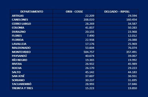 AgenciaUypress – Concluido el escrutinio primario, presentamos el cuadro con la votación de las dos fórmulas en cada departamento (datos oficiales).