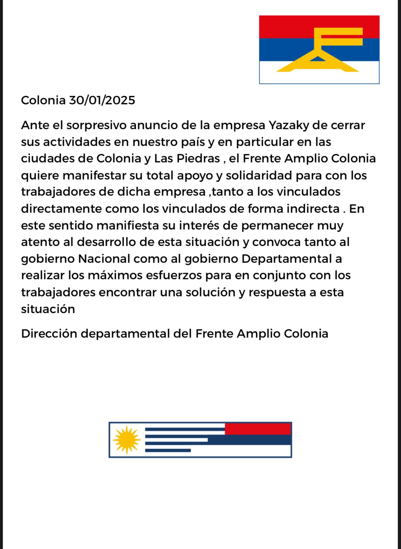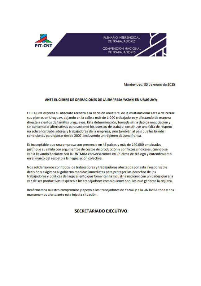 Este Jueves, 30 Enero el Secretariado Eejecutivo del «PIT-CNT expreso su absoluto rechazo a la decisión unilateral de la multinacional japonesa Yazaki de cerrar sus plantas en Uruguay, dejando en la calle a más de 1.000 trabajadores y afectando de manera directa a cientos de familias uruguayas.