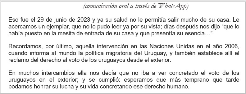 En el año 2017 ella organizó en el parlamento del Uruguay la presencia de la senadora Isabel Allende para informar a todos los partidos políticos del Uruguay cómo había sido el proceso para que chile en el 2014 aprobara la norma para que los chilenos pudieran votar desde el exterior. Chile fue el último país, en el 2014, que faltaba aprobarlo.