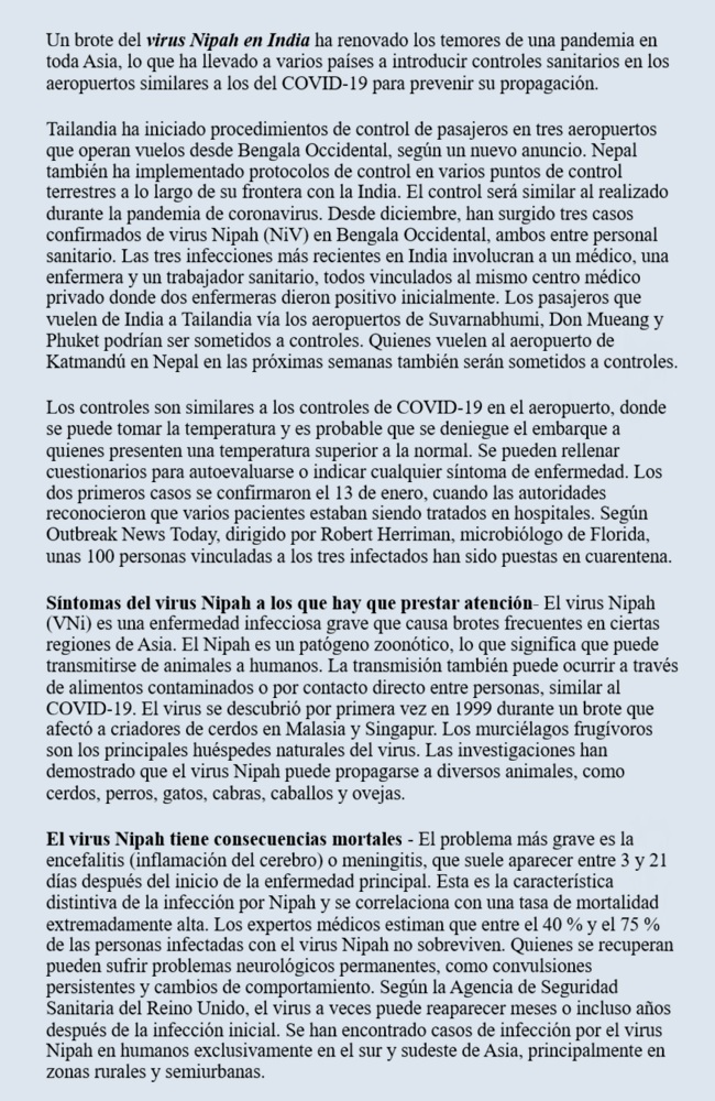 / La Organización Mundial de la Salud finalmente se ha pronunciado sobre el virus que está causando estragos en todo el mundo. El brote del virus, para el cual aún no se conoce una vacuna (llamado Nipah), ha obligado a muchos países asiáticos a reforzar su seguridad fronteriza.