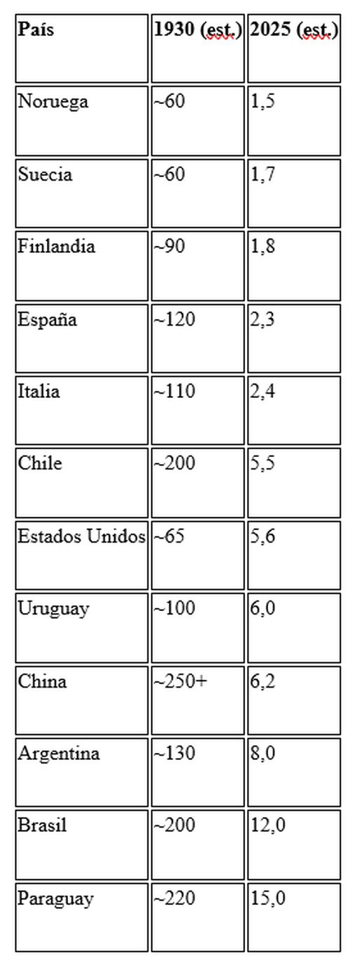 El caso de China es verdaderamente impresionante desde una perspectiva estadística. En 1930, la mortalidad infantil era extremadamente elevada (se estima que superaba los 250 niños muertos por cada 1.000 nacidos vivos en muchas regiones), debido a la suma de guerras, pobreza extrema y desnutrición. Haber logrado reducir esa cifra a niveles de 6,2 en 2025 es notable.